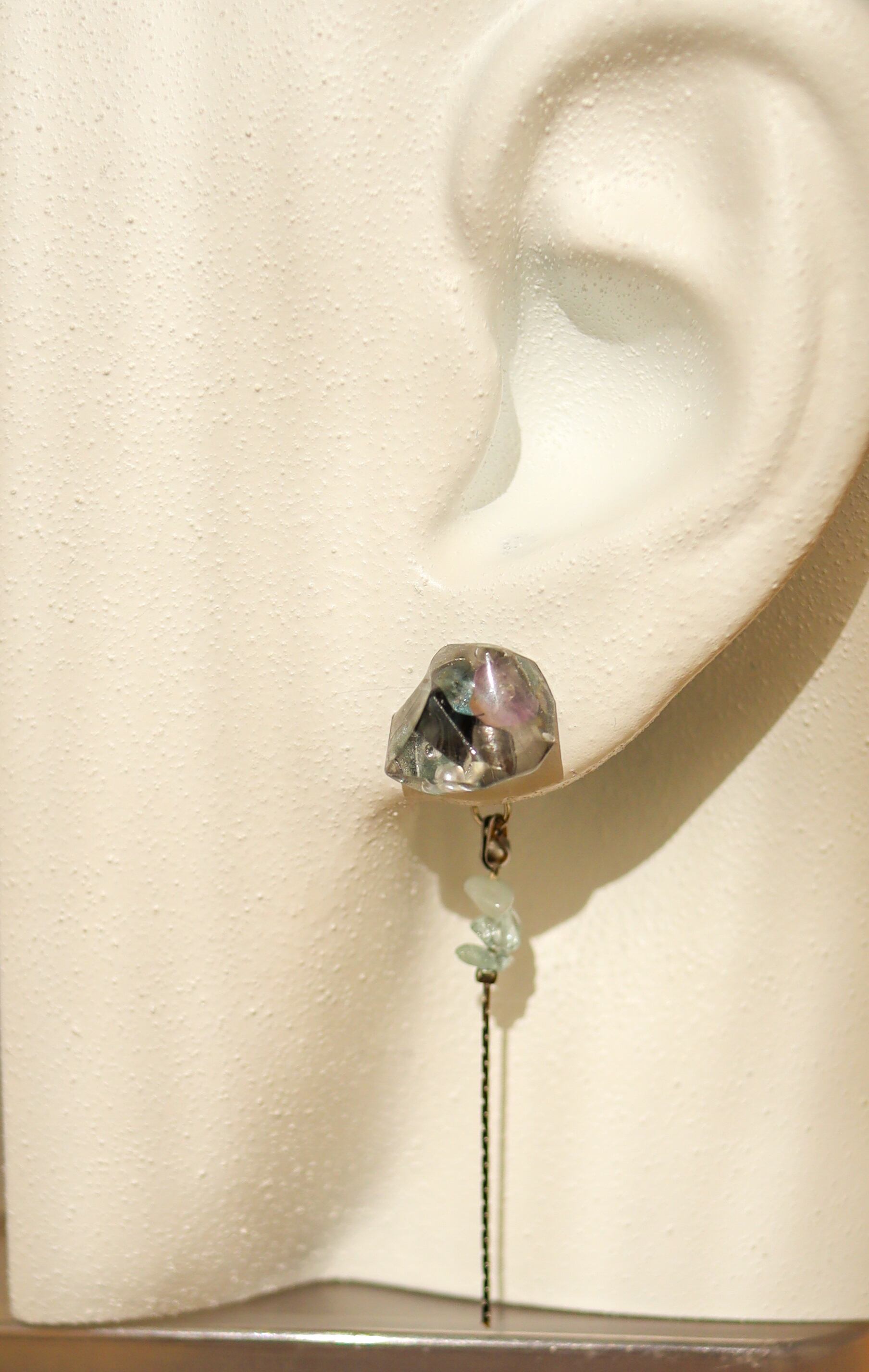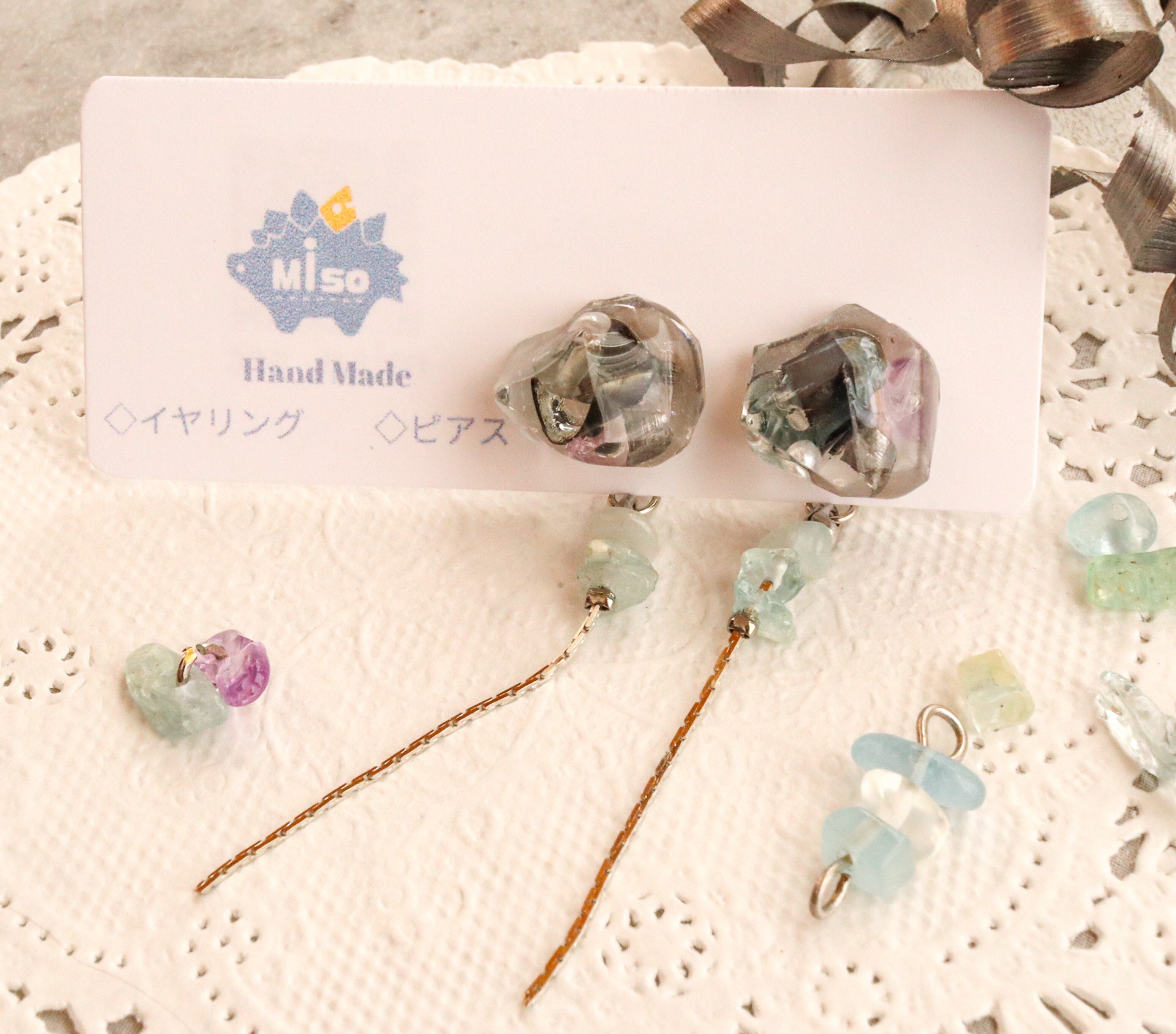 天然石のアクアマリン、アメジストのさざれ石をレジンに閉じ込めたアクセサリです。